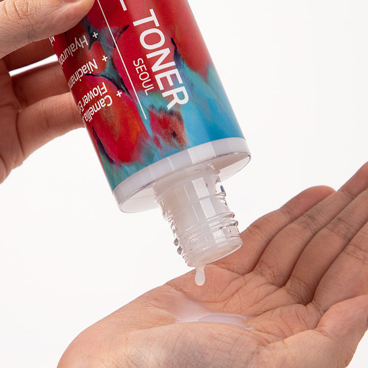 A moisture-locking toner formulated with 72% camellia flower extract, 10 types of hyaluronic acid, and amino acid complex for deep hydration and whitening benefits.